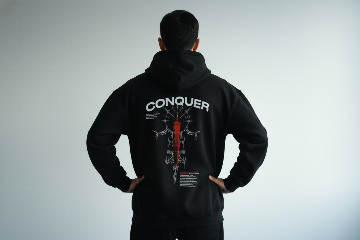 A must-have for streetwear lovers. This black hoodie showcases a detailed Conquer artwork on the back, offering a mix of comfort, edge, and modern aesthetic. Pair it with joggers, cargos, or denim for an effortless statement look.